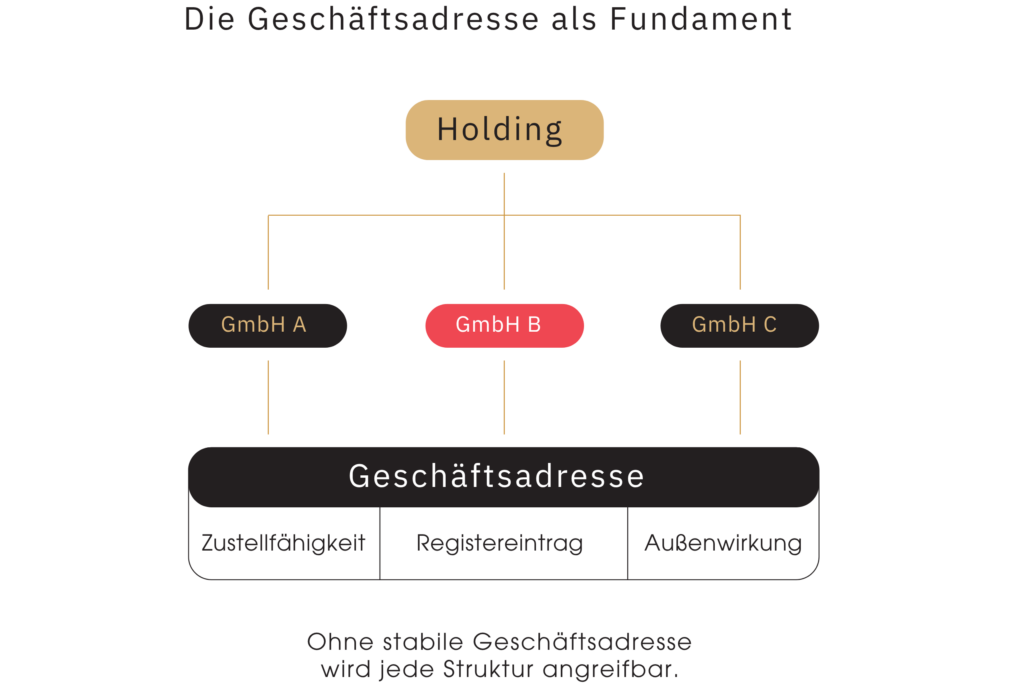 In practice, this means that each legal entity (holding company, operating GmbH, IP company, real estate GmbH, etc.) needs its own, clean business address that enables delivery and is reliably managed.