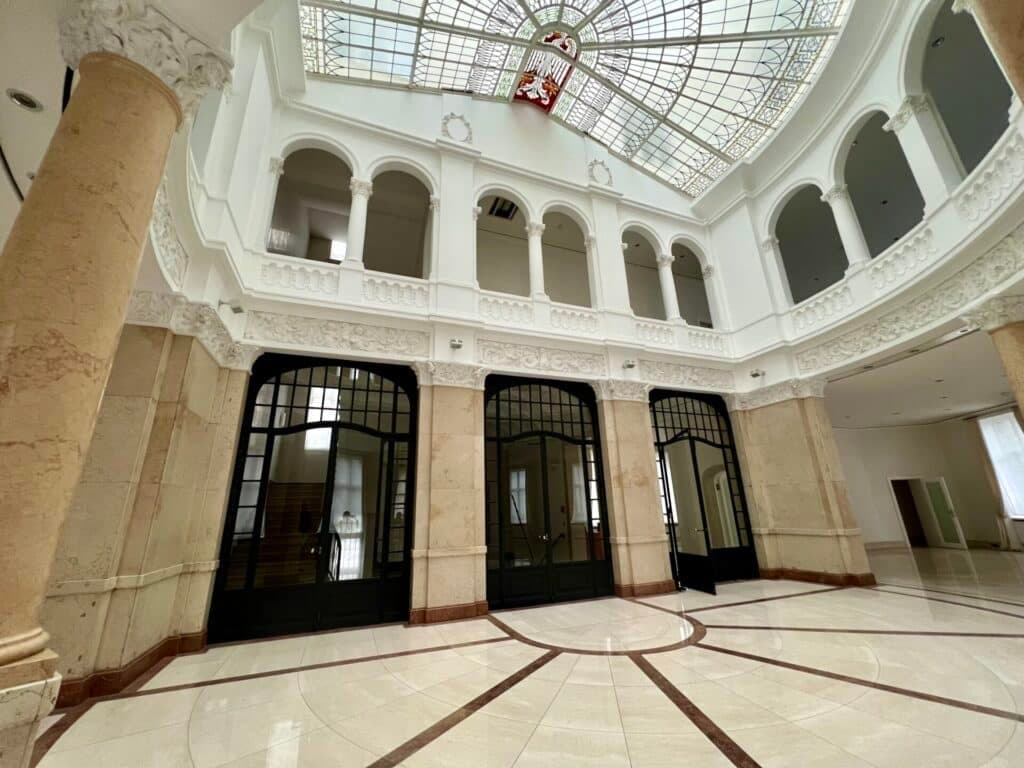 Den Ausbau planen wir gemeinsam, er muss dem Service-Gedanken Rechnung tragen, der SATELLITE OFFICE ausmacht – abgesehen von der Location, die ja auch immer die Handschrift von Frau Gödiker trägt. 42 Büros werden auf 5 Stockwerken entstehen, dazu Konferenzräume und Kaminlounges, Think Tanks und Tagesbüros. Und das Foyer eignet sich ja auch als Veranstaltungsort – je nachdem, wie man es einrichtet.